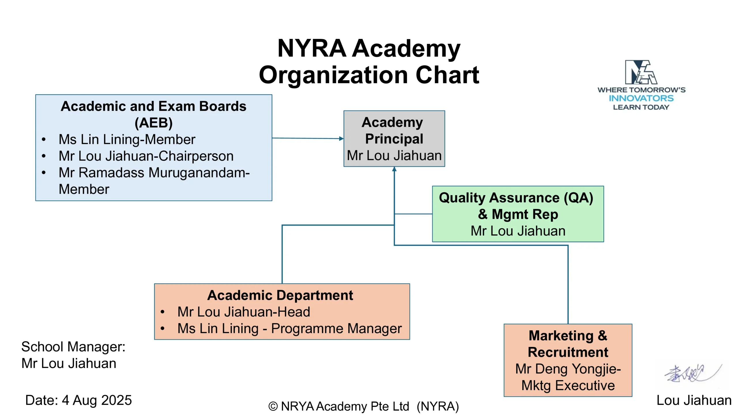 At NYRA Academy, our management and academic leadership team brings together over 13–18 years of experience in the education sector, supported by strong academic qualifications from leading international universities. Collectively, they ensure that our students receive not only quality education but also the benefit of practical knowledge, innovation, and global perspectives. The Organizational Chart of NYRA Academy highlights the key appointed members of the Academic and Examination Board, each with clearly defined responsibilities to maintain academic standards and operational excellence. The chart is regularly reviewed and updated to reflect accurate and timely information, ensuring transparency and accountability in our governance. Parson Lou Academic Principal Date: 25 July 2025